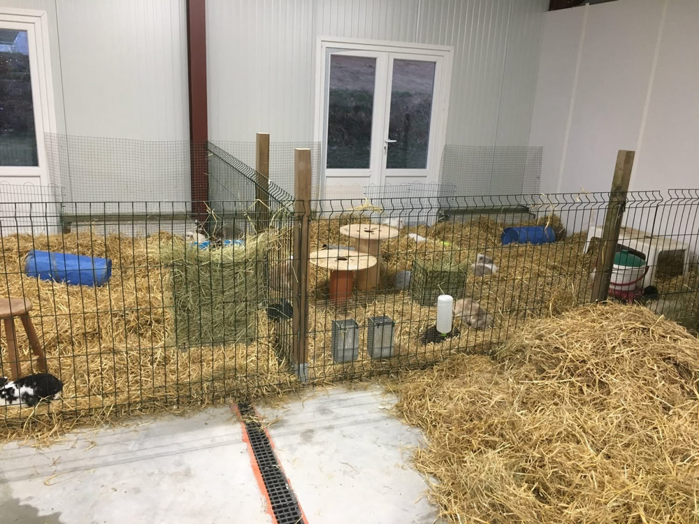 Les lapins sont installés sur des caillebotis avec paille : un bac de récupération de fumier est en dessous. Les femelles avec bébés ont un bac de litière ou ils sont initiés à la propreté.